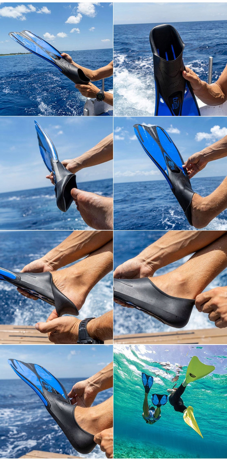 - Dwa rodzaje materiałów o trwałych i lekkich właściwościach sprawiają, że konstrukcja płetw ma wyjątkową jakość